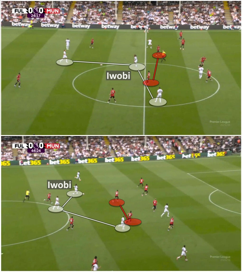 Mặt khác, với nhân sự đông người hơn ở tuyến giữa, chiến thuật của Silva là tìm cách áp đảo quân số trước cặp tiền vệ trung tâm của Man Utd, giúp Alex Iwobi – người được phép hoạt động ở nách trái trung lộ – trở thành nhân tố tự do trong tấn công và buộc trung vệ Leny Yoro phải dâng lên theo kèm thường xuyên. Khi hiệp hai dần trôi, Fulham bắt đầu kiểm soát tuyến giữa hoàn toàn, cả trận họa kiểm soát 52%.