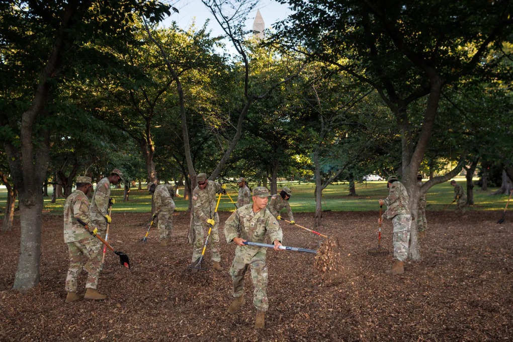 Lính DCNG dọn dẹp phố phường Washington trong bối cảnh Tổng thống Donald Trump điều động họ và lực lượng liên bang để trấn áp tội phạm ở vùng thủ đô. Ngày 22/8, ông tuyên bố sẽ yêu cầu quốc hội chi khoảng 2 tỷ USD để "làm đẹp" Washington, song song với nỗ lực tăng cường an ninh.