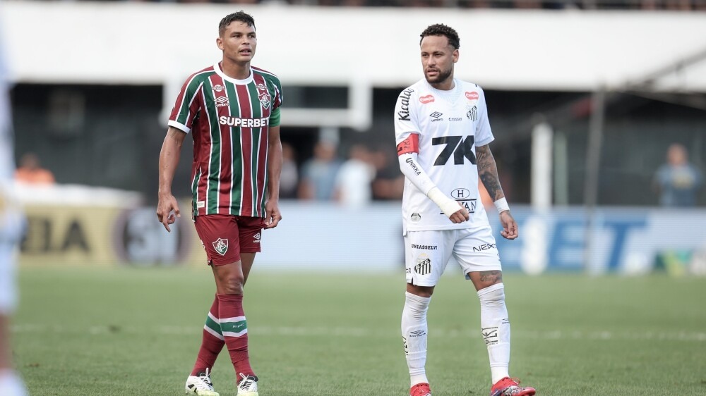 Neymar (phải) đối đầu đồng đội cũ ở tuyển Brazil và PSG, Thiago Silva trong trận Santos 0-0 Fluminense hôm 31/8. Ảnh: AP