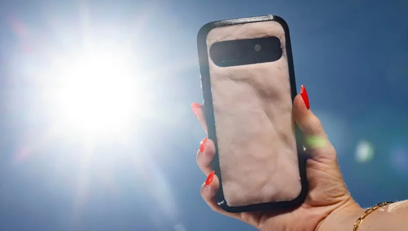 Chiếc ốp lưng "da người" báo hiệu nhiệt độ cao, tia UV gây hại. Ảnh: O2.