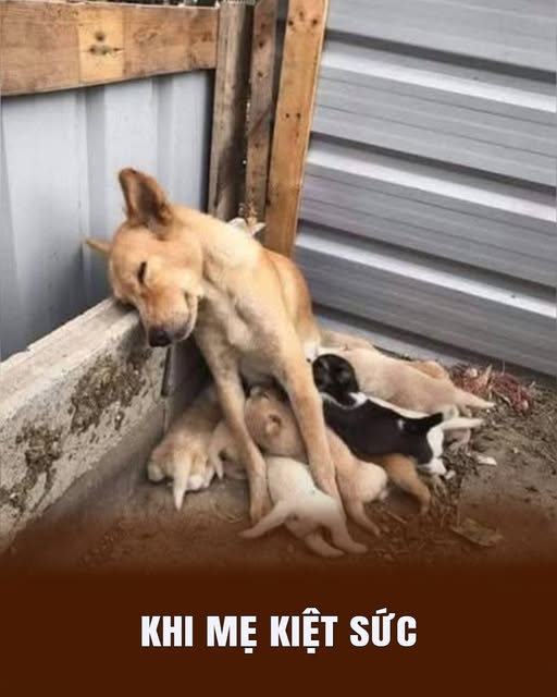 Cô chó mẹ nằm ngủ gục ở đó, lưng dựa vào tấm ván ọp ẹp, thân xác rã rời. Chung quanh là đàn con nhỏ xíu, đói khát, chỉ biết tìm hơi ấm, tìm chút sữa từ bầu vú gầy guộc để mà sống. Cô gần như chẳng còn gì, nhưng vẫn cố gắng cho đi. Đôi mắt nhắm nghiền không phải là vì yên bình, mà vì mệt mỏi tột cùng của một người mẹ đơn độc, bị bỏ mặc giữa đời. Cái góc đất bụi bặm kia nào phải là tổ ấm. Nó không phải mái nhà. Chỉ là chỗ trú tạm, vừa chật hẹp, vừa lạnh lẽo, vừa cứng ngắc. Thế mà cô vẫn bám lấy, bởi đó là nơi duy nhất có thể che chở đàn con.