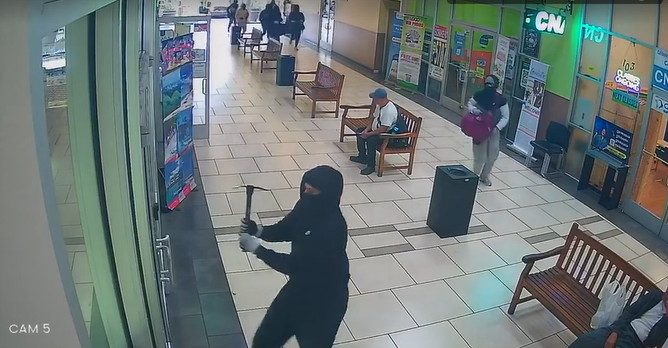 Camera an ninh ghi lại cảnh nhóm cướp bịt mặt, mang búa cố gắng phá cửa xông vào cửa tiệm nằm bên trong Siêu thị Seafood City, khu phức hợp kinh doanh của người châu Á tại thành phố. Nhóm cướp tháo chạy sau khi chủ tiệm bắn một phát súng cảnh cáo.