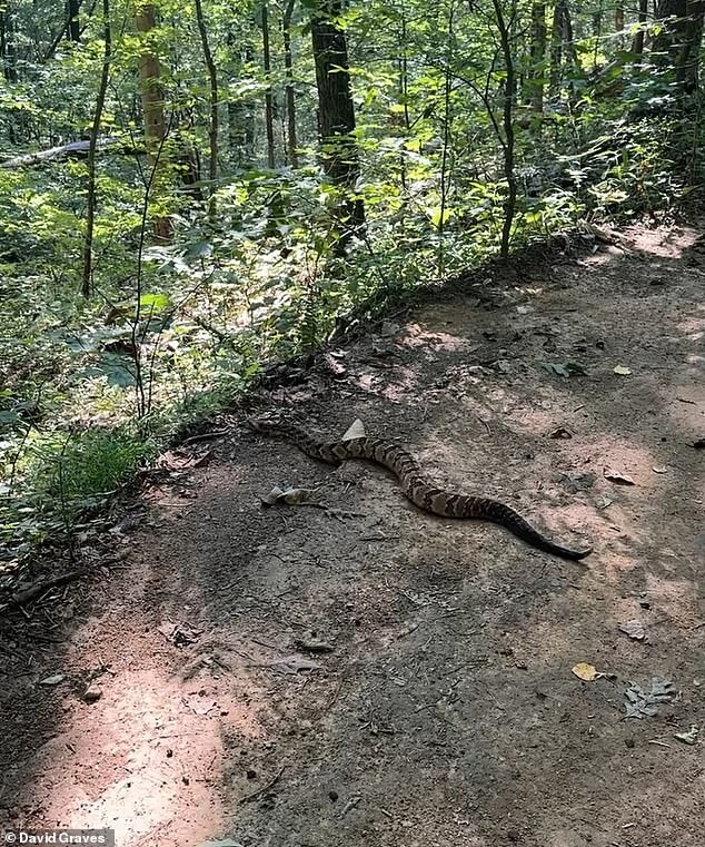 Một người đàn ông đang đi bộ qua những con đường mòn tuyệt đẹp của công viên thì bị rắn đuôi chuông khổng lồ chặn lại.