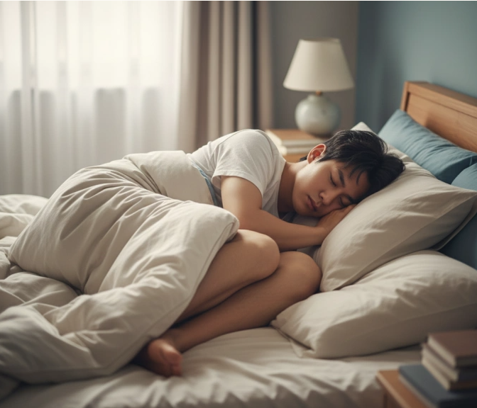 Tư thế ngủ bào thai dễ gây khó chịu, đau mỏi ở hông, lưng và đầu gối. Ảnh: AI