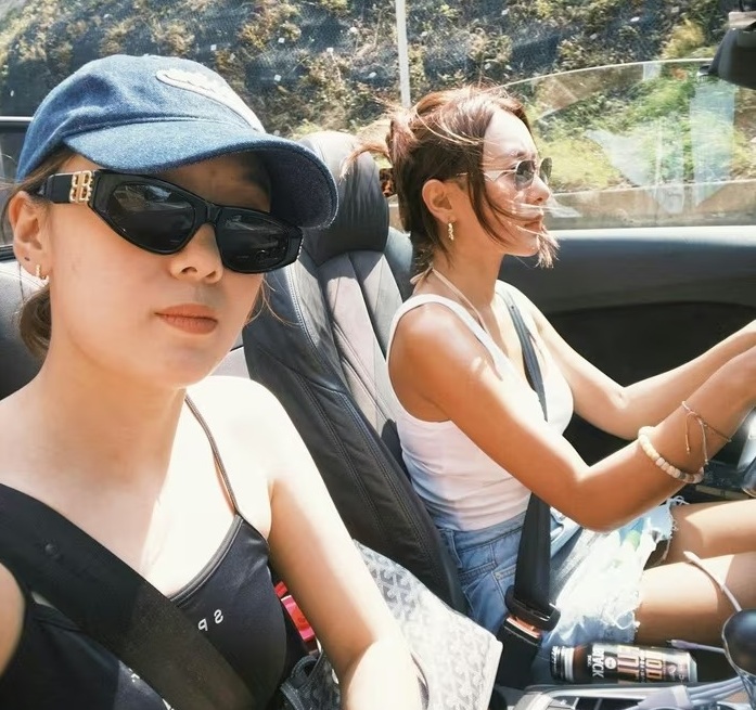 Ở một bức ảnh khác, diễn viên cùng bạn thân lái xe mui trần tắm nắng. Người hâm mộ bày tỏ thích thú khi Hà Bội Du thay đổi hình tượng với làn da rám nắng khỏe khoắn, thay vì trắng hồng như trước.