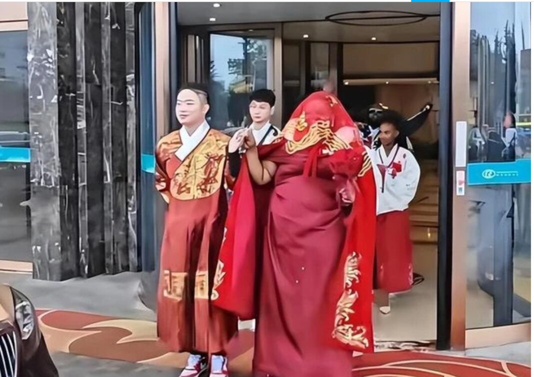 Sáng hôm đó, cô dâu mặc chiếc váy đỏ trễ vai, nhẹ nhàng giúp chú rể cài hoa lên áo. Khi di chuyển ra sảnh tiệc, cô đổi sang bộ lễ phục đỏ, trùm khăn voan che mặt. Chen ân cần đỡ tay, sợ vợ vấp váy ngã.