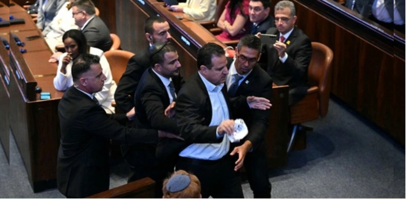 Theo truyền thông địa phương, hai nghị sĩ Ayman Odeh và Ofer Cassif, thuộc liên minh cánh tả chủ yếu đại diện cho người Arab Hadash-Ta’al, đã giơ cao tấm biển ghi dòng chữ “Công nhận Palestine!”. Hành động này ngay lập tức gây náo động trong hội trường, buộc lực lượng an ninh phải hộ tống cả hai ra ngoài.