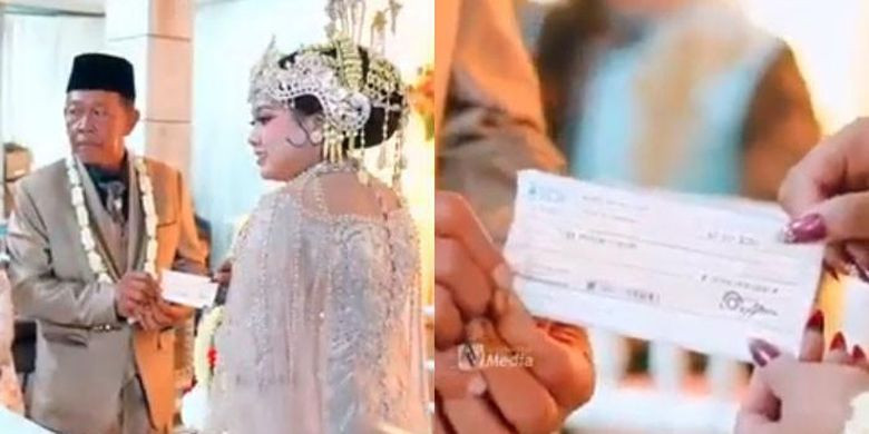 Chú rể trao tấm séc có giá trị lớn cho cô dâu. Ảnh: Kompas