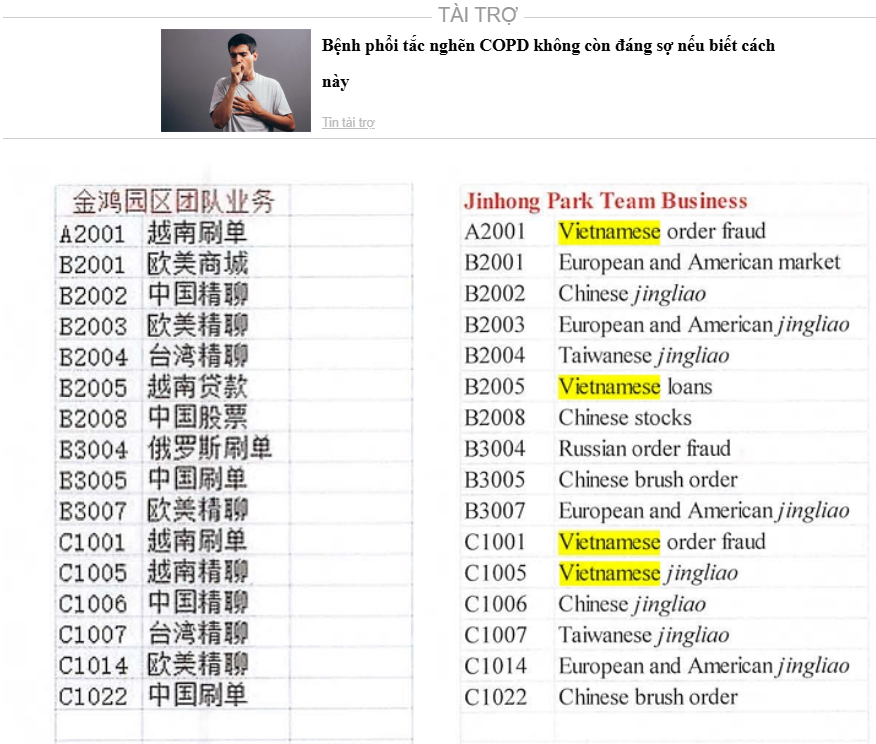 Đáng chú ý, một sổ kế toán do Chen lưu giữ đã theo dõi chi tiết các loại hình gian lận khác nhau được thực hiện từ khu Jinhong Park của Prince Group, thậm chí còn xác định rõ tòa nhà và tầng nào trong khu đó chịu trách nhiệm cho từng loại gian lận. Các loại hình gian lận được liệt kê cho thấy chiến lược nhắm mục tiêu đa dạng, bao gồm: “Vietnamese order fraud” (Lừa đảo đơn hàng ở Việt Nam); “Russian order fraud” (Lừa đảo đơn hàng ở Nga); “European and American jingliao” (Trò chuyện theo kịch bản nhắm vào châu Âu và Mỹ); Các hình thức “jingliao” khác nhắm vào đối tượng “Vietnamese”, “Chinese” và “Taiwanese”; “Chinese brush order” (Gian lận trong mua sắm trực tuyến ở Trung Quốc).