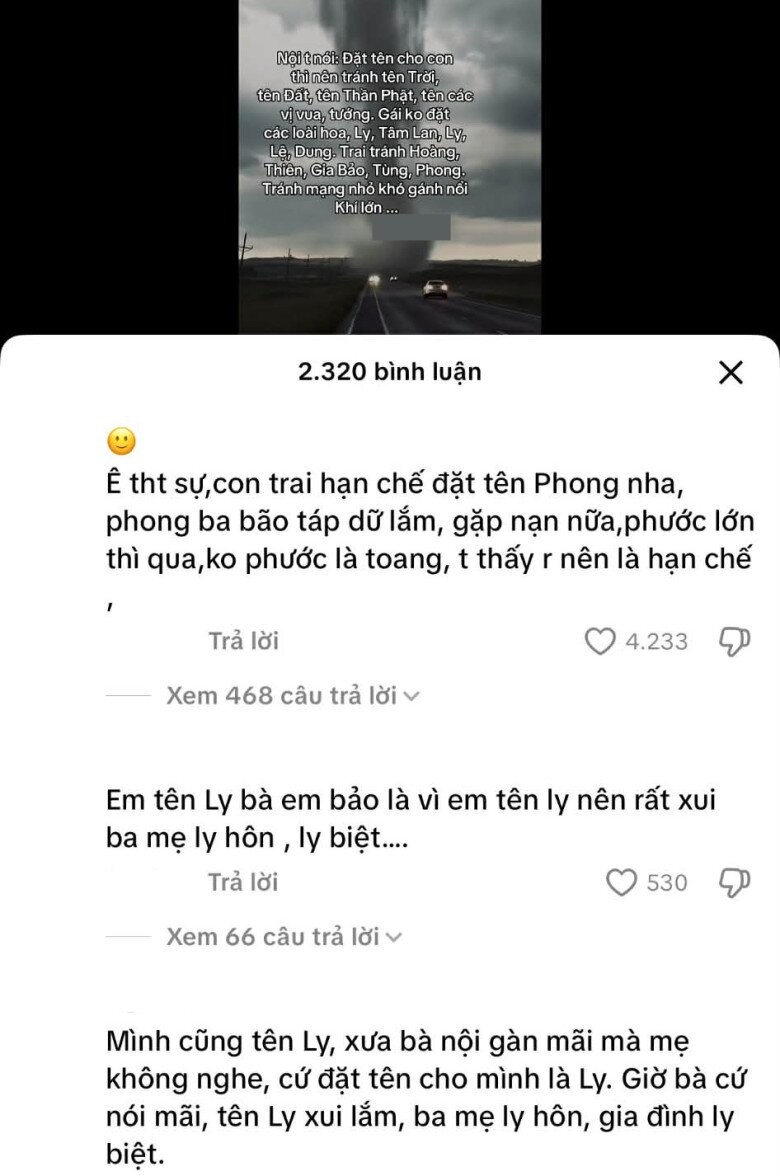 "Nội tôi nói, đặt tên cho con thì nên tránh tên Trời, tên Đất, tên Thần Phật, tên các vị vua, tướng. Gái không đặt các loài hoa Ly, Tâm Lan, Lệ, Dung. Trai thì tránh Hoàng, Thiên, Gia Bảo, Tùng, Phong... Nói chung là ý nghĩa của nó không được hay" - người này viết.