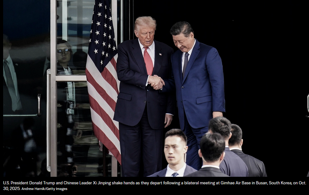 Tổng thống Mỹ Donald Trump và Chủ tịch Trung Quốc Tập Cận Bình bắt tay nhau khi rời đi sau cuộc gặp song phương tại Căn cứ Không quân Gimhae ở Busan, Hàn Quốc, vào ngày 30 tháng 10 năm 2025. Andrew Harnik/Getty Images