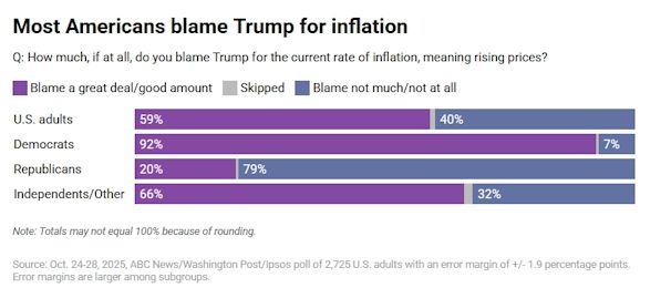 About 6 in 10 Americans blame Trump for the current rate of inflation, including about a third who say he bears a "great deal" of blame, compared with 4 in 10 who say he does not bear much responsibility for inflation.