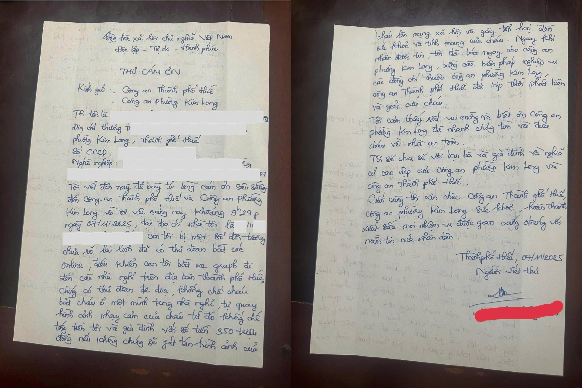 Sau khi anh K được giải cứu thoát khỏi vụ "bắt cóc online", gia đình anh này đã viết thư cảm ơn Công an phường Kim Long và Công an TP.Huế.
