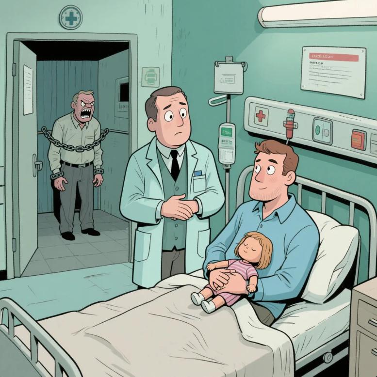 Đến một phòng, ông chỉ vào một người đàn ông đang ôm chặt con búp bê vào lòng, mắt đăm chiêu như đang yêu: