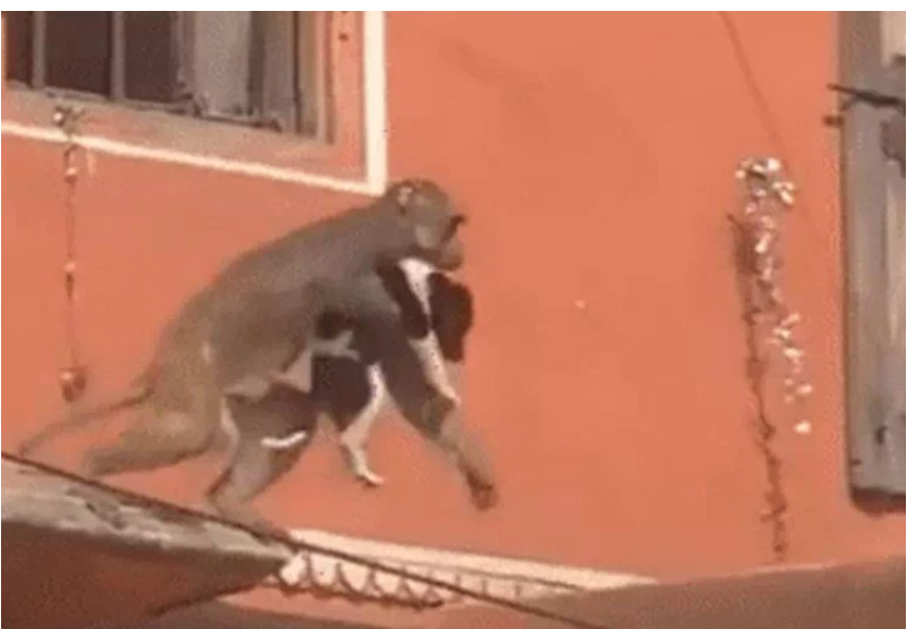 Old  Default Khỉ hoang liều lĩnh ‘bắt cóc’ chó con giữa chợ đông người rồi nhảy lên mái nhà tẩu thoát