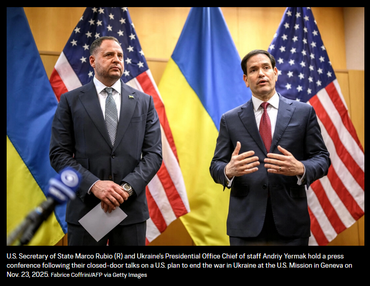 U.S. Secretary of State Marco Rubio (R) and Ukraine's Presidential Office Chief of staff Andriy Yermak hold a press conference following their closed-door talks on a U.S. plan to end the war in Ukraine at the U.S. Mission in Geneva on Nov. 23, 2025. Fabrice Coffrini/AFP via Getty Images