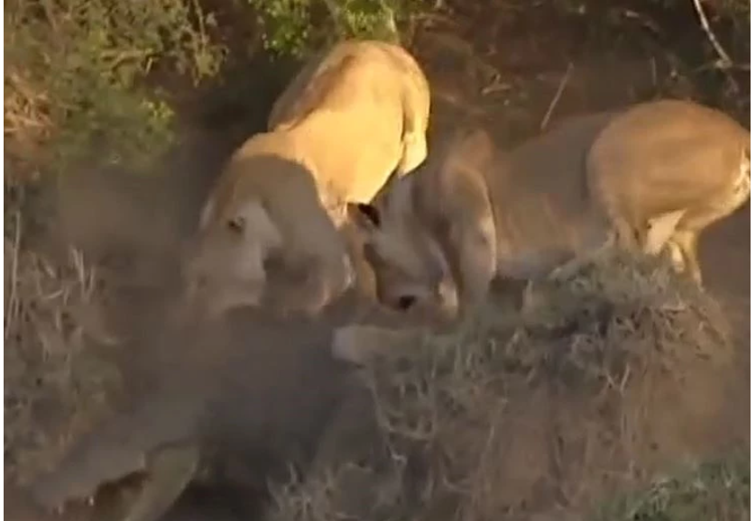 Tuy nhiên, khi 4 con sư tử cùng lúc lao vào cắn xé, con cá sấu lập tức phản công. Nó há to hàm răng sắc như dao, bật ra đ̣n tấn công quyết liệt khiến đàn sư tử chững lại. Nhận thấy nguy cơ bị thương nặng và không thể giành phần thắng, cả nhóm sư tử nhanh chóng rút lui.