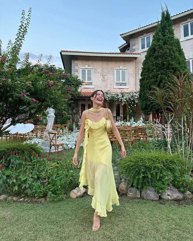 Yaya chọn phong cách đi ăn cưới đơn giản mà vẫn nổi bật khi diện váy hai dây màu vàng tươi bắt mắt. Thiết kế gây ấn tượng với phần cổ yếm kèm dải khăn mảnh quàng cổ cùng những đường bèo mềm mại dọc thân váy, tạo cảm giác nữ tính và bay bổng