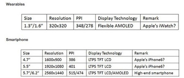 Ngoài ra DisplaySearch cũng dự đoán rằng đồng hồ thông minh Apple iWatch sẽ được trang bị màn hình AMOLED. DisplaySearch cho biết chiếc đồng hồ này sẽ mang theo một màn hình AMOLED dẻo 1,3 inch hoặc1,6 inch với mật độ điểm ảnh dao động từ 348ppi đến 278ppi. Máy tính bảng khổng lồ iPad Pro cũng được DisplaySearch cung cấp thông tin cho thấy nó sẽ có màn hình 12.9 inch với độ phân giải 2.732x2.048 pixel tương đương với mật độ điểm ảnh 265ppi.