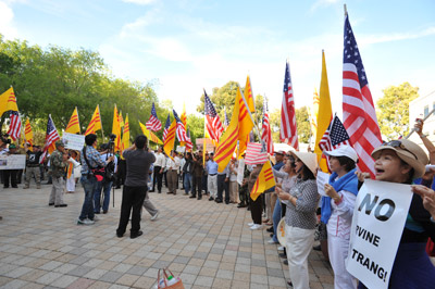 Ðông đảo đồng hương Việt Nam có mặt tại tòa thị chính Irvine phản đối kết nghĩa với Nha Trang. (Hình: Dân Huỳnh/Người Việt)