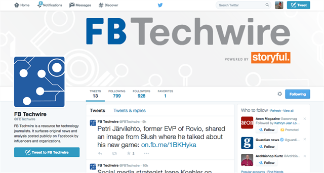 Facebook và Storyful vừa công bố cho ra đời một tiện ích dành cho các nhà báo hay những ai thường xuyên săn tin công nghệ có thể cập nhật tin tức ngay-tức-thời (real time). Tiện ích này có tên FB Techwire, là một bước đi được mong đợi từ rất lâu từ người dùng Facebook yêu cong nghệ, nhất là người dùng tại Việt Nam.