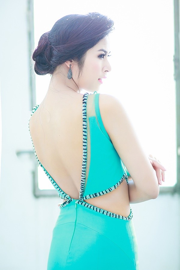 Chiếc đầm gợi cảm màu xanh khoe khéo số đo 3 vòng tuyệt đẹp, cùng làn da trắng mịn màng của Hoa hậu Việt Nam 2010.