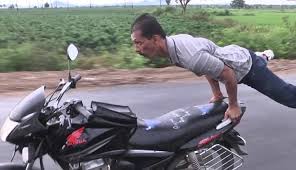 Một người đàn ông 40 tuổi đến từ Ấn Độ có biệt tài vừa chạy xe máy tốc độ 60km/h vừa biểu diễn những động tác trong bài tập Yoga của mình.