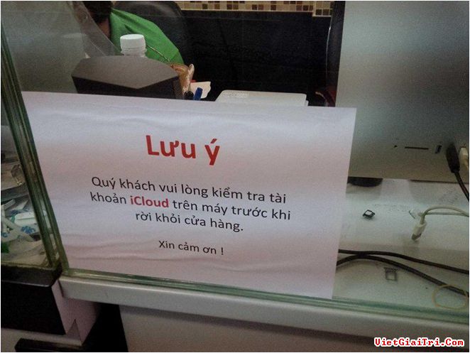 Tấm biển nhắc nhở sau hàng loạt sự cố về iCloud do nhiều khách gây ra tại một cửa hàng ở TP.HCM. Ảnh: Thành Nguyễn.