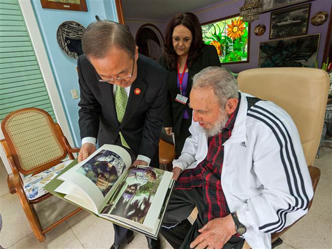 Mới đây Fidel Catro trong ảnh gặp với ông tổng thống Pháp Francois Hollande dẫn đầu sang thăm Havana vừa ký thỏa thuận về khai thác dầu ngoài khơi. Trong ảnh có thể thấy chủ tịch lãnh tụ Cuba mặc áo Adidas.