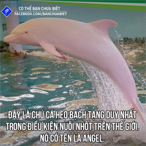 Đây là cá heo bạch tạng duy nhất trên thế giới trong điều kiện nuôi nhốt. Trên thực tế, Angel có lớp da màu hồng nhạt và đôi mắt hồng đậm hơn. Cá heo Angel hiện sống trong Bảo tàng Cá voi Taiji của Nhật Bản, sau khi được phát hiện trong hoạt động săn bắt ở Taiji hồi tháng 1 năm ngoái. Theo Business Insider, bạch tạng xảy ra khi một con vật hoàn toàn thiếu sắc tố melamin, một hợp chất tạo màu cho da và mắt. Nhờ vậy, cá heo Angel thuộc dạng động vật quý hiếm.