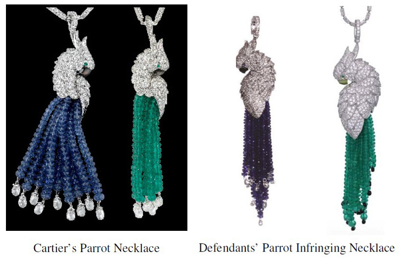 NEWPORT BEACH – Hãng sản xuất trang sức nổi tiếng Cartier đang kiện một tiệm kim hoàn ở Newport Beach, tiểu bang California, vì cho rằng tiệm này đã làm nhái một mặt dây chuyền kim cương hình con vẹt của hãng. Mẫu dây chuyền trong sự việc này có hình con vẹt có bộ lông bằng kim cương trắng, mắt bằng ngọc lục bảo, và chiếc đuôi dài bằng những hạt đá màu xanh dương hoặc xanh lá cây, và chót đuôi là những viên ngọc trai.