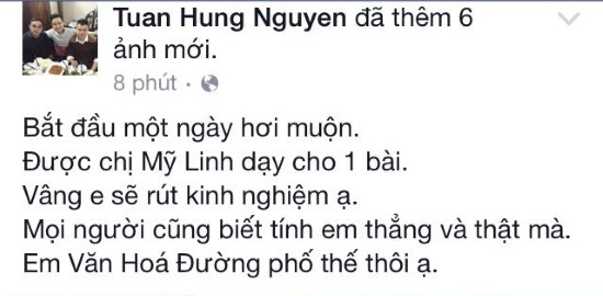 Đáp lại sự chân thành mà đàn chị dành cho mình, sau khi đã gỡ bảo đoạn chia sẻ bức xúc cũ, Tuấn Hưng lại tiếp tục có những chia sẻ mới trên trang cá nhân với nội dung: ''Bắt đầu một ngày hơi muộn. Được chị Mỹ Linh dạy cho một bài. Vâng em sẽ rút kinh nghiệm ạ. Mọi người cũng biết tính em thẳng và thật mà. Em văn hóa đường phố thế thôi ạ''.