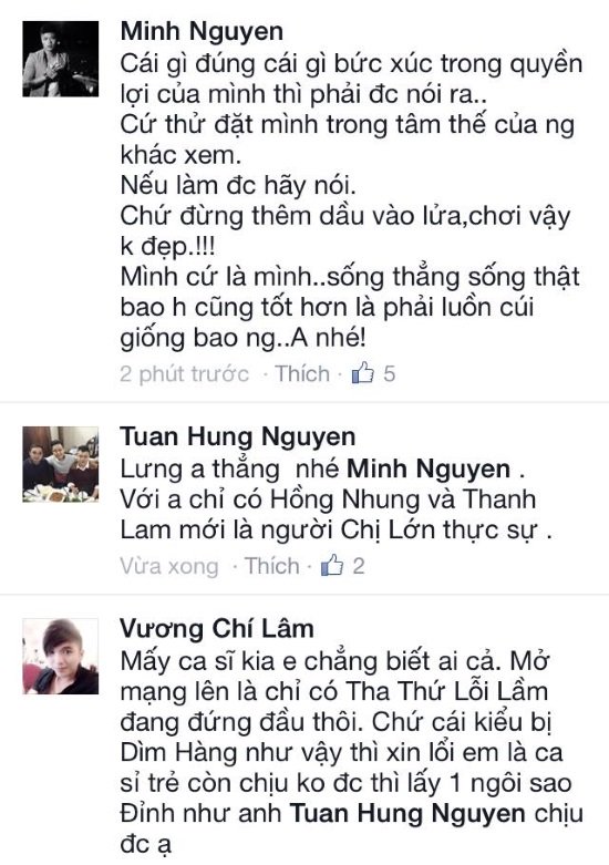 Bên cạnh đó, Tuấn Hưng còn đăng tải những hình ảnh chụp lại bình luận của nhiều người trên mạng. Đa phần những bình luận này đều đến từ những người ủng hộ nam ca sĩ và lên tiếng phản bác lại Mỹ Linh. Không những thế, huấn luyện viên của The Voice 2015 còn cho biết đối với anh chỉ có Thanh Lam và Hồng Nhung mới là người chị lớn thực sự.