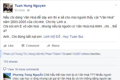 "Nếu chị dùng Văn Hoá để dạy em thì em sẽ cho mọi người thấy cái "Văn Hoá" năm 2003-2005 của chị nhé. Chị Mỹ Linh ạ Chị nói em em vô văn hoá, nhưng nếu là người có Văn Hoá mà anh, chị thế à? Anh, chị đừng bắt nạt em", Tuấn Hưng bày tỏ trên trang cá nhân.