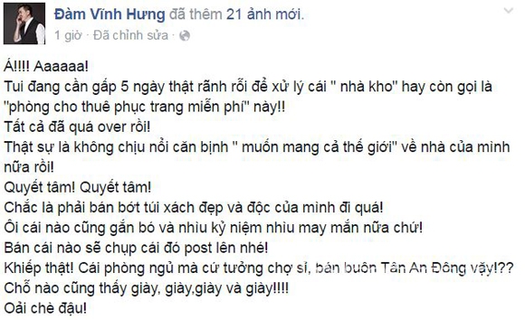 Mới đây trên trang cá nhân, Đàm Vĩnh Hưng khiến nhiều người choáng váng với kho hàng hiệu "khủng" từ giày, túi xách đến quần áo. Vì số lượng quá nhiều mà Đàm Vĩnh Hưng cũng có ý định rao bán một số món hàng hiệu mà mình không dùng đến.