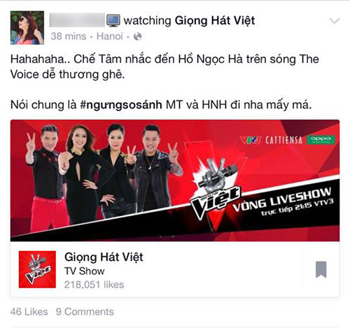 Tối 16/8, trên sóng trực tiếp chương trình "Giọng hát Việt", Mỹ Tâm khiến tất cả các khán giả tại trường quay cũng nhưng đang xem truyền hình bất ngờ trước câu nói tiếp lời huấn luyện viên Đàm Vĩnh Hưng có ngụ ý khen ngợi Hồ Ngọc Hà.