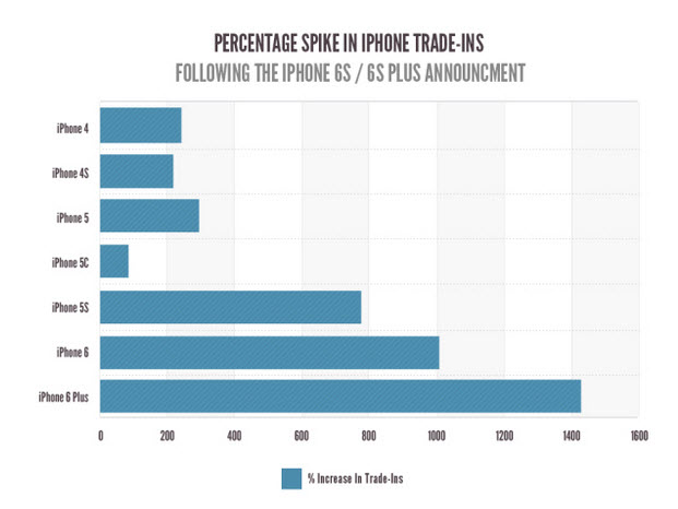 Mặc dù vậy, chỉ sau một lần cập nhật, dòng “S” mới lập tức khiến số lượng người tham gia các chương trình đổi iPhone tăng lên chưa từng thấy. Ngoài ra, CompareMyMobile còn cho biết, giá trị của những chiếc iPhone 6 và 6S đã qua sử dụng giảm sâu hơn bất cứ đời iPhone nào trước đó của Apple. Dữ liệu của công ty này được thu thập từ 2 tuần trước ngày mở bán mỗi loại iPhone và so sánh số lượng cũng như giá cả sau 2 tuần kể từ khi mỗi chiếc iPhone mới được bán ra.