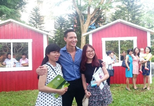 Sau khi trò chuyện với Đại sứ Thụy Điển tại Việt Nam Camilla Mellander, Kim Lý vui vẻ khi được các bạn trẻ xin chụp ảnh cùng. Rất đông các sinh viên, những người đã tốt nghiệp đại học và có kinh nghiệm công tác tới tham dự sự kiện để tìm hiểu việc học tập và nghiên cứu tại Thụy Điển.