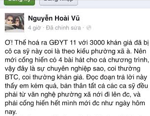 "Ơ thế hoá ra GĐYT (tên của chương trình là Giai Điệu Yêu Thương) 11, với hơn 3000 khán giả đã bị cô ca sỹ này coi là theo kiểu phường xã à? nên mới cống hiến 4 bài hát cho cả chương trình.