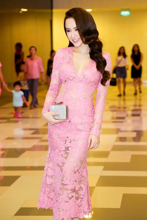 Xuất hiện ở một sự kiện diễn ra tại TP.HCM, Angela Phương Trinh diện bộ đầm ren xuyên thấu ôm sát tone hồng cánh sen nền nã của NTK Lý Quí Khánh kết hợp cùng clutch mini ánh kim sang trọng. Mái tóc xoăn sóng cùng vẻ ngoài tươi tắn, rạng rỡ khiến “bà mẹ nhí” trở nên nổi bật, thu hút mọi ống kính của cánh paparazzi.
