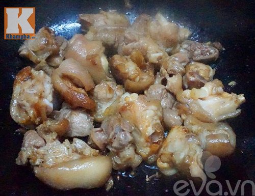 Bước 4: Bắc chảo lên bếp, thêm 2 thìa dầu ăn, sau đó cho giò heo vào đảo thật săn lại. Bạn cũng có thể chiên sơ giò heo.