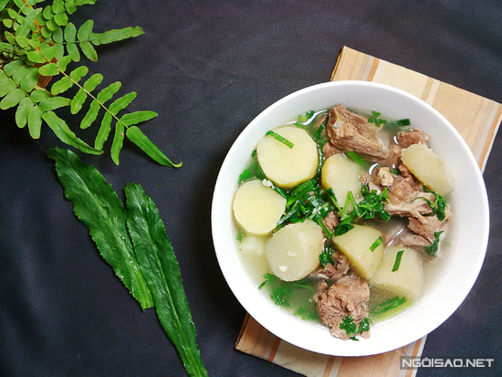 - Bạn đảo cho sườn săn lại rồi cho lượng nước vừa ăn vào đun đến sôi khoảng 10 phút thì thêm củ từ đã thái vào nấu chung. Đun đến khi củ từ chín mềm thì nêm nếm lại gia vị cho vừa ăn rồi cho hành lá, rau mùi và mùi tàu vào đảo đều là xong.