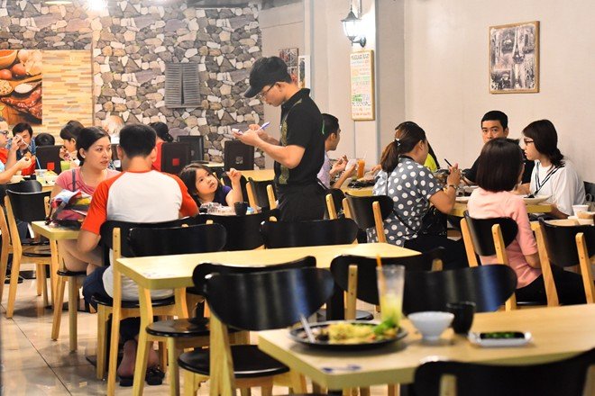 Vào giờ cao điểm của phố đi bộ Nguyễn Huệ, dịch vụ ăn uống bình dân đông nghịt khách ra vào. Ảnh: Zen Nguyễn.