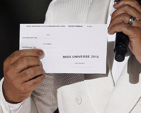 Sáng nay (theo giờ Việt Nam), ngôi vị Hoa hậu Hoàn vũ 2015 đã xướng tên người chiến thắng là đại diện Philippines - Pia Wurtzbach. Tuy nhiên trước đó, MC của chương trình đã công bố Á Hậu 1 là đại diện Philippines, Hoa hậu là đại diện Colombia. Đại diện Colombia chưa kịp vui mừng thì Ban tổ chức đã phải gửi lời xin lỗi đến khán giả vì sự cố nhầm lẫn đáng tiếc.