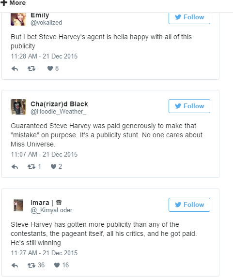 Những ý kiến trái chiều thì vẫn liên tục được đưa ra và việc liệu rằng tính xác thực trong kết quả năm nay cũng như việc Steve Harvey đọc nhầm kết quả có nằm trong sự sắp xếp hay không vẫn chỉ là những phỏng đoán.