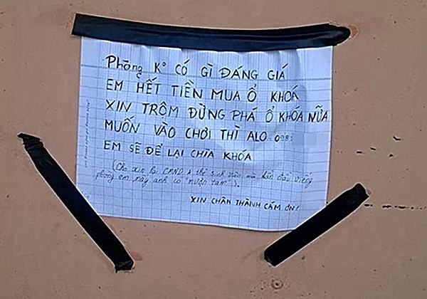 Kính gửi: Ăn trộm đã và đang có ý định trộm đồ phòng chúng em. Vừa qua có ba vụ mất trộm đã xảy ra tại phòng chúng em. Tài sản quý giá đã bị anh chị mượn đi rồi. Hiện giờ chúng em đang nghèo và rất ư là nghèo. Xin đừng dòm ngó phòng chúng em nữa vì hết tài sản có giá trị trên 50.000 đồng rồi.
