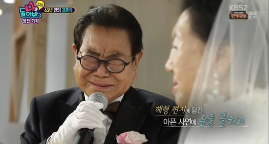 Vị MC quốc dân 89 tuổi của Hàn Quốc này không ai khác chính là MC Song Hae. Mới đây đám cưới vàng của ông và vợ mình đã được tổ chức sau 63 năm chung sống. Trong buổi hôn lễ, một khoảnh khắc cảm động đã diễn ra khi ông còn tự mình đọc bức thư gửi đến người vợ hiền dịu của mình.