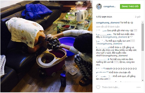 Trong hình ảnh, Công Phượng quỳ gối trên ghế salon, đầu hướng về phía trước và có hai người phụ nữ đang giúp anh chàng gội đầu. Ngoài tư thế ngồi kỳ quái, người hâm mộ còn nhanh chóng phát hiện được dụng cụ mà anh chàng dùng để gội đầu đó là một chiếc xô vắt giẻ lau nhà. “Trận chiến” gội đầu của chàng cầu thủ trẻ tuổi khiến người hâm mộ vừa buồn cười mà lại đầy xót xa.