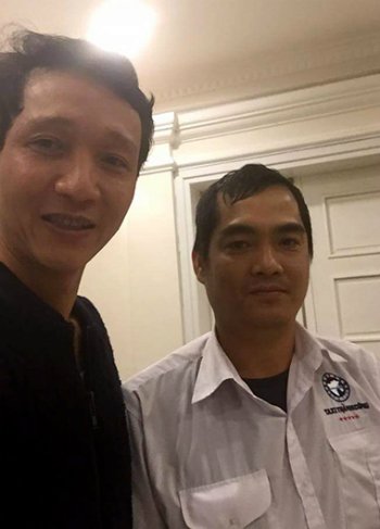 Anh Quân (áo đen) chụp hình cùng anh Khánh bằng chính chiếc điện thoại do người tài xế mang trả.