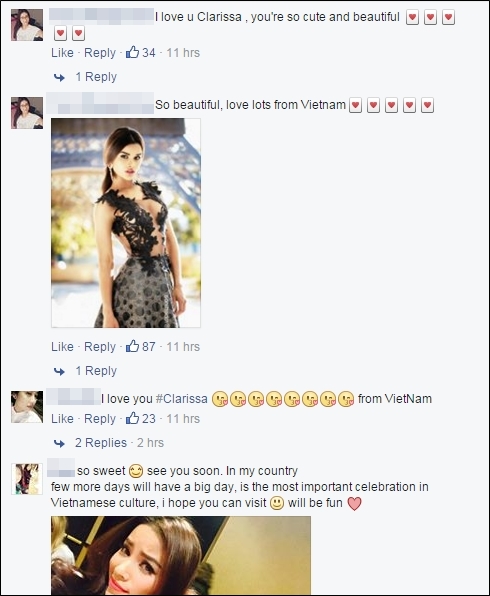 Ngay lập tức, trang fanpage của người đẹp nhanh chóng bị “khủng bố” bởi hàng trăm bình luận. Hầu hết các fan Việt đều tranh thủ bày tỏ tình cảm yêu mến tới Clarissa Molina.